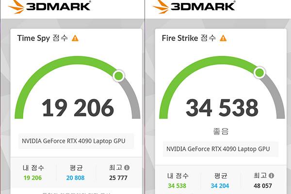 엔비디아 지포스 RTX 4090의 성능을 알아볼 시간이다. 3DMark를 통해 테스트한 결과로 타임 스파이 점수 19,206점, 파이어 스트라이크 점수 34,538점을 기록하였다. 점수를 두고 보았을 때 MSI 레이더 18 HX A14VIG-i9는 AAA급 게임을 충분히 돌릴 수 있는 정도다.