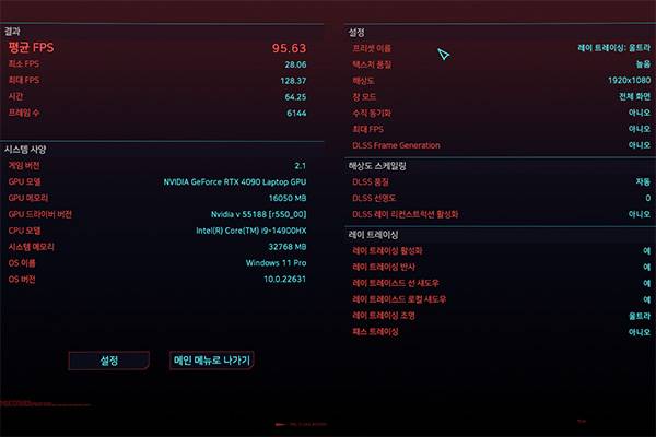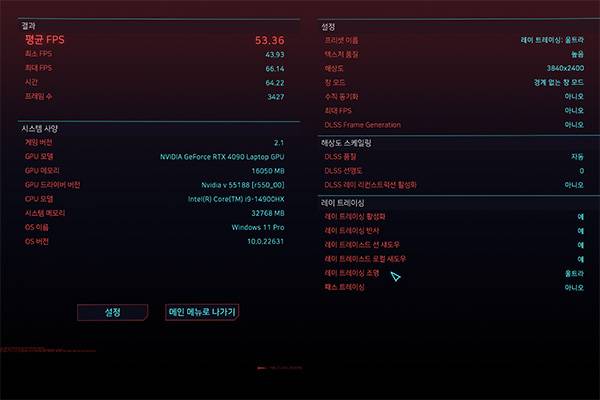 실제 게임 성능은 어떨까? 여러 게임을 통해 MSI 레이더 18 HX A14VIG-i9의 성능을 확인해보았다. 우선 사이버펑크 2077의 벤치마크를 진행해보았는데, FHD(1920*1080) 환경에서 DLSS 레이 트레이싱을 활성화하였을 때 95.63FPS이, 4K(3840*2400) 환경에서는 동일 조건에서 53.36FPS이 나왔다. 즉 4K 환경도 무리 없이 플레이 가능하다는 결과를 알 수 있다.