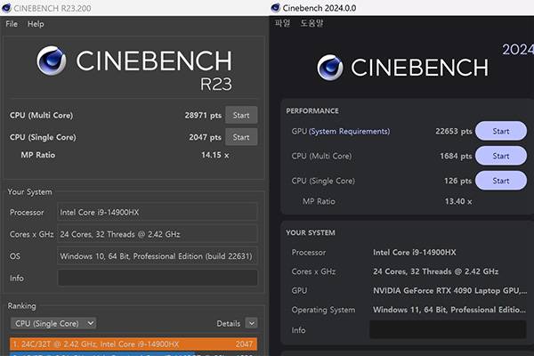 실제 다양한 벤치마크를 통해 MSI 레이더 18 HX A14VIG-i9의 성능을 확인해보았다. 우선 시네벤치에서는 시네벤치 R23에서 멀티코어 점수 28,971점, 싱글 코어 점수 2,047점을 기록하였으며 2024버전에서는 각각 1,684점과 126점을 기록하였다. 이를 통해 확실히 이전 모델보다 멀티코어 성능에서 우위를 점하는 걸 확인할 수 있었으며, 별도로 GPU 점수는 22,653점을 기록하였다.