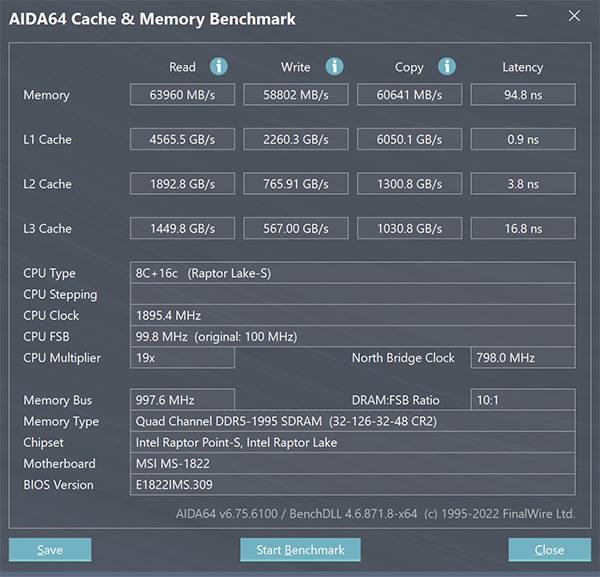 다음은 메모리 및 캐시 성능을 확인할 수 있는 AIDA64 벤치마크다. 읽기속도는 63,960MB/s, 쓰기 속도 58,802MB/s, 레이턴시 94.8ns를 기록하였으며 이는 DDR5 메모리의 빠른 성능 덕이다.