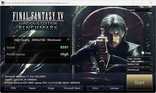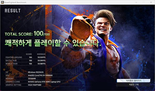 다음은 파이널 판타지 15와 스트리트파이터6의 벤치마크 결과다. 파이널 판타지 15는 4K 환경에서 높은 옵션일 때 8,591점의 높은 점수를 기록하였고, 스트리트파이터6는 FHD(1920*1080)에 높은 옵션일 때 60FPS을 거뜬하게 소화해 쾌적한 플레이가 가능했다.