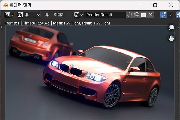다음은 3D 기능을 확인할 수 있는 블렌더 렌더링 결과다. 벤츠 데모 버전을 렌더링한 결과 1분 24초로 매우 빠른 속도를 확인할 수 있었다.