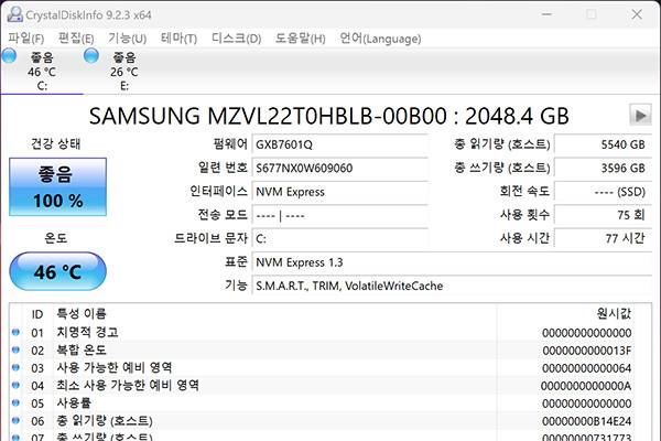 크리스탈디스크 인포로 스토리지 정보를 확인한 결과, MSI 레이더 18 HX A14VIG-i9에는 삼성의 MZVL22T0HBLB 2TB NVMe SSD가 탑재되어 있는 걸 알 수 있었다.