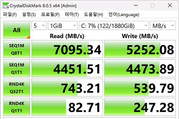 SSD의 성능을 확인할 수 있는 크리스탈디스크마크 테스트 결과다. MSI 레이더 18 HX A14VIG-i9에 탑재된 삼성전자 2TB NVMe SSD는 순차 읽기 7,095MB/s에 순차 쓰기 5,252MB/s로 빠른 속도를 자랑했다. 이를 통해 사용자는 게임이나 작업에서 버벅임 없는 쾌적한 환경을 유지 가능하다.