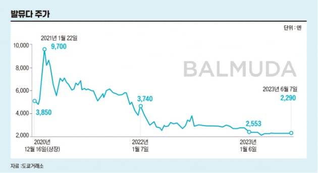 주가도 급락했다. 2020년 12월 일본 스타트업 전문 주식 시장인 마더스에 상장한 발뮤다는 상장 직후 공모가 대비 63% 오른 3150엔으로 시작했다. 2021년 1월에는 최고가를 찍었다. 9700엔까지 오르며 1만 엔을 바라봤던 주가는 현재(6월 7일) 2290엔까지 떨어졌다. 최고가 대비 4분의 1토막이 났다. 올해도 하락세가 이어지고 있다. 발뮤다의 주가는 6개월 동안 18.3% 하락했다.