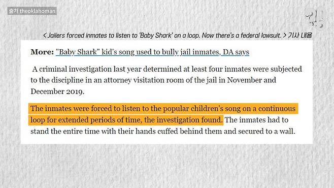 유튜브 댓글로 “아기상어 같은 노래를 반복해서 들려주는 고문이 있다는데, 얼마나 고통스러운 건지 알아봐달라”는 의뢰가 들어와 취재해봤다. 결론부터 말하면 음악 무한반복 재생은 CIA도 애용하던 고문법인데, 한국 법원에서는 이를 폭행에 해당한다고 판단한 적 있다.