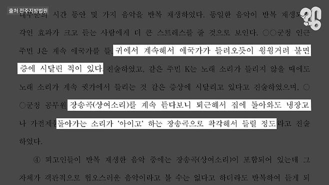 2018년 전주지법은 군부대가 자기 동네로 이전하는 것을 막으려는 주민들이 애국가와 장송곡 등을 군청 앞에서 계속 튼 행동에 대해 “동일한 음악이 반복 재생되면 각인 효과가 크고 듣는 사람에게 더 큰 스트레스를 줄 것으로 보인다”고 판단했는데, ‘애국가가 계속 귀에 들려오듯 윙윙거려 불면증에 시달린다’ ‘장송곡을 계속 듣다 보니 퇴근하고 집에 와서도 냉장고 돌아가는 소리가 장송곡으로 착각해서 들릴 정도’라는 피해자들의 진술이 증거가 됐다. 상대를 괴롭히기 위해 아기상어를 강제로 들려주다간 폭행으로 잡혀갈 수 있으니 조심하시라
