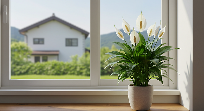 스파티필름(평화백합): 공기 정화 능력이 뛰어나며, 부드러운 잎의 형태가 심리적 안정감을 줍니다.