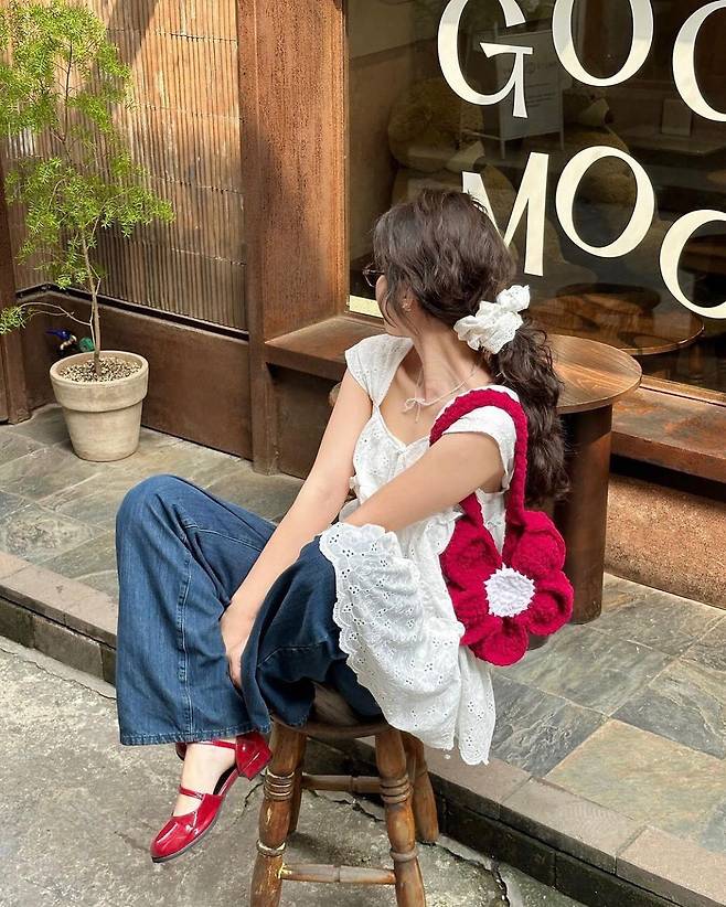 심플한 화이트·블랙·네이비 코디에 강렬한 레드·옐로·그린 가방을 매치하면