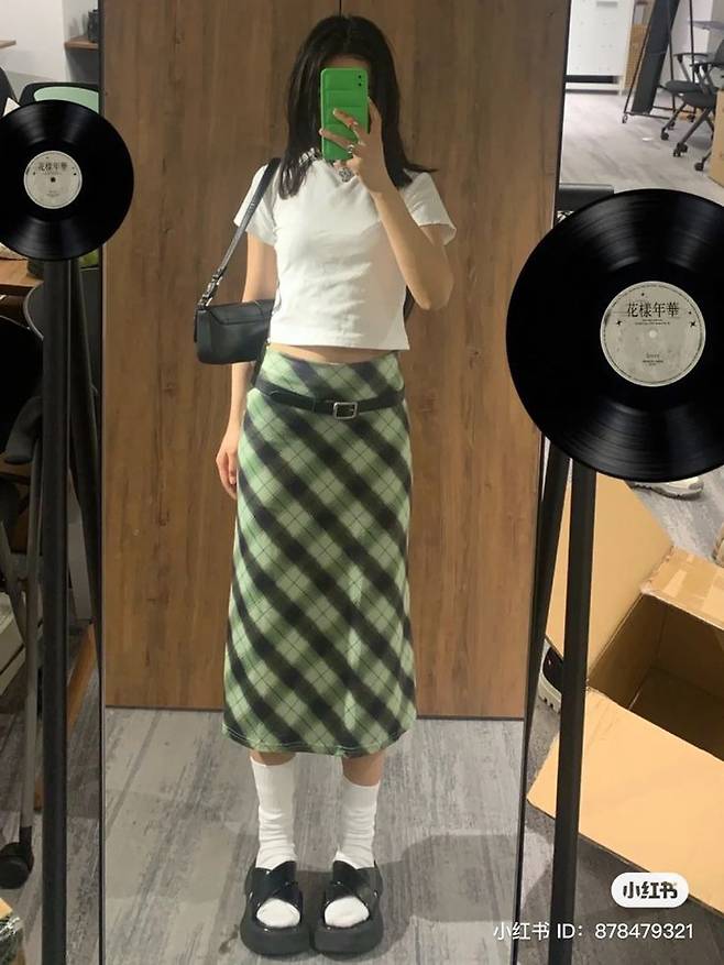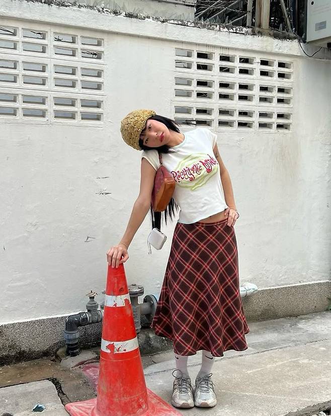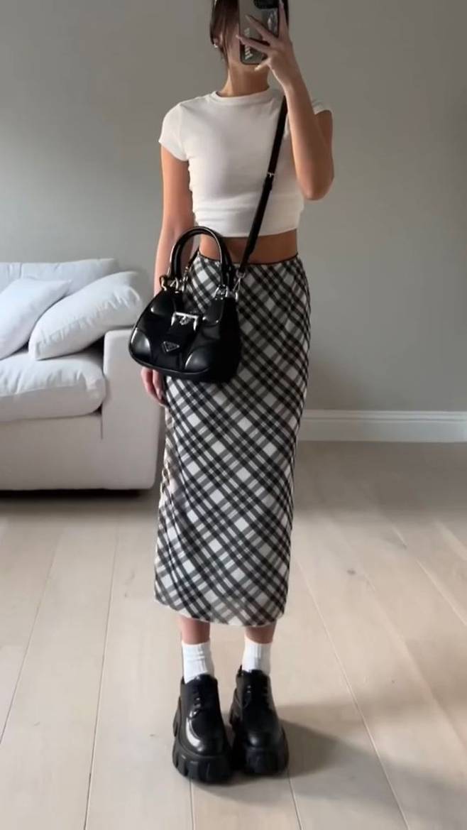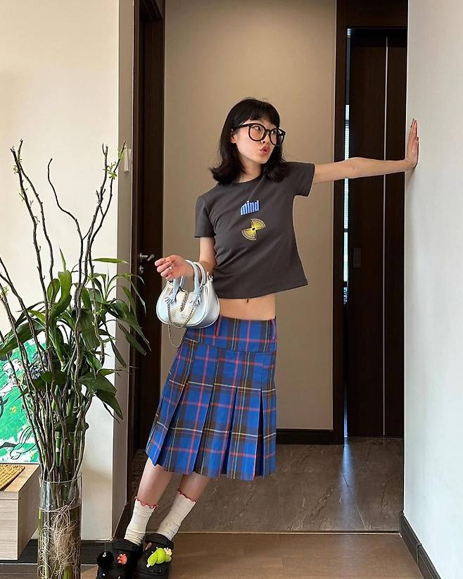 패턴이 있는 옷에는 무지 컬러의 미니백으로 깔끔함을 더하는 것이 좋습니다.