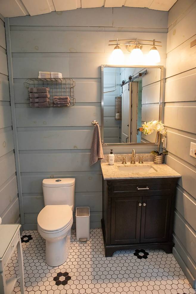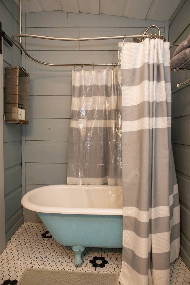 욕실은 파란색 벽과 매력적인 타일 바닥으로 항해하는 느낌을 물씬 풍기며, 복고풍 집게발 욕조, 싱크대와 대형 거울이 있는 화장대, 변기 등이 갖춰져 있다.