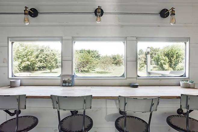 4명이 앉을 수 있는 긴 나무 바 카운터는 식사 공간으로 활용될 수 있으며, 일렬로 늘어선 창 아래에 배치돼 주변 풍경의 멋진 전망을 제공한다.