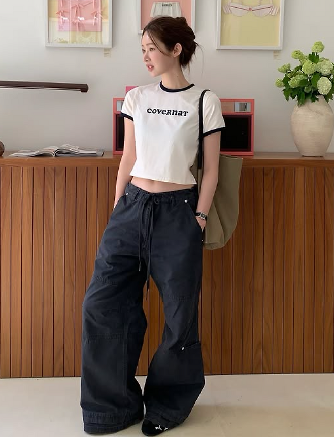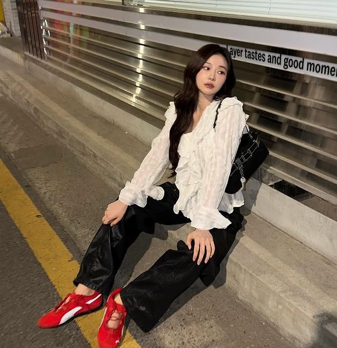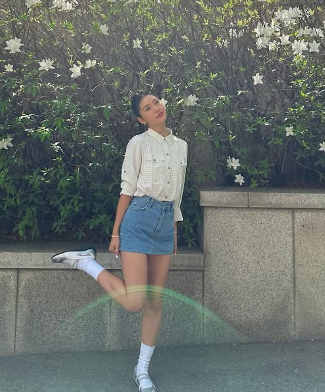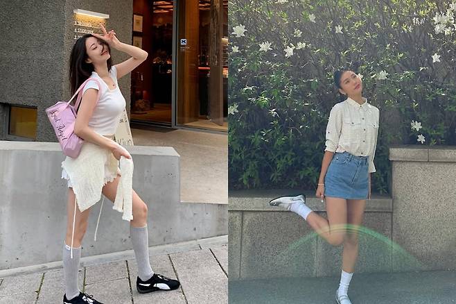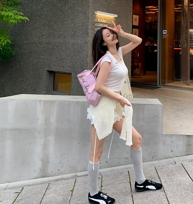 같은 제품을 다른 무드로 소화한 경리는 흰 티셔츠, 프릴 스커트, 회색 니삭스로 ‘발레코어 룩’을 완성했다.
