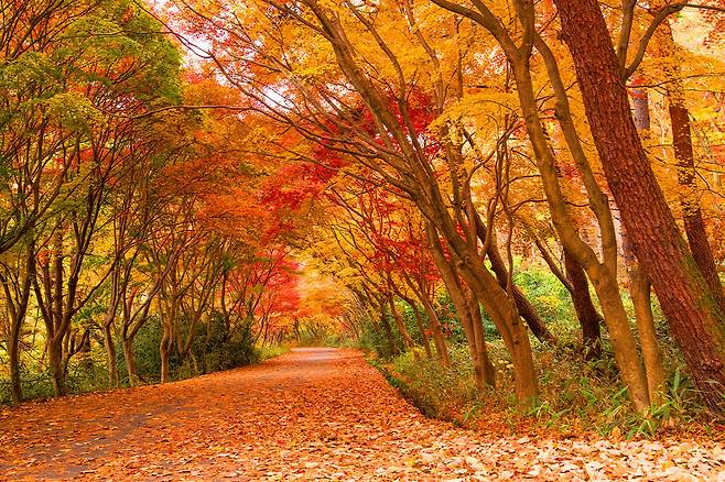 청명한 하늘을 가득 메운 울창한 단풍나무 길을 거닐면 새로운 세계에 온 듯한 신비로운 감상을 선사합니다.