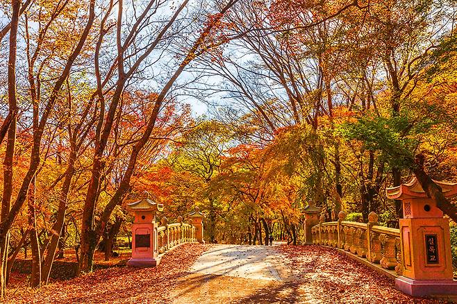 무등산 산책로는 가을이 되면 형형색색의 단풍으로 물들여져 화려한 터널이 형성됩니다.