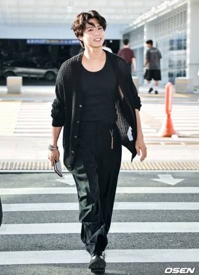 이번 공항 패션에서 그는 민소매 탑, 와이드 팬츠, 루즈핏 가디건, 그리고 신발까지 전부 블랙 색상으로 맞추며 완벽한 컬러 통일감을 보여줬습니다. 특히 이너 민소매 탑은 몸에 슬림하게 핏되었고, 팬츠는 와이드한 실루엣으로 하체의 비율을 극대화시켰죠.