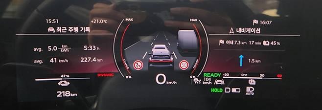 시승 간에 가장 만족스러웠던 점은 전력소비효율(전비) 및 주행가능거리다. 서울 종각역에서 출발해 양평, 원주를 거쳐 돌아오는 코스로 왕복 주행 거리는 약 235㎞다. 출발 전 배터리는 93%, 주행가능 거리는 502㎞로 표기됐는데, 시승 후에는 배터리 잔량 45%, 주행가능 거리 210㎞로 나타났다.