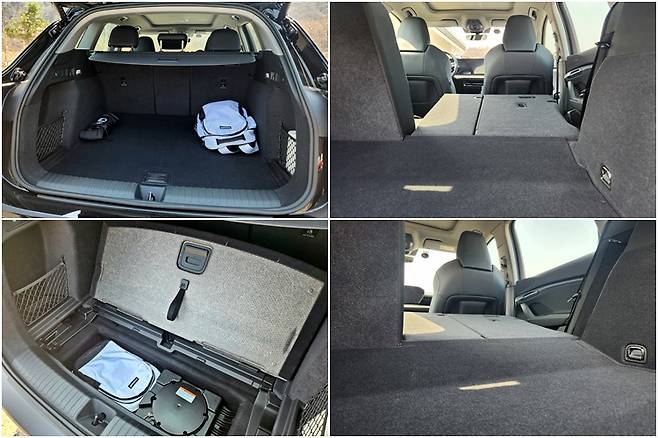 2열 시트는 왼쪽 6, 오른쪽 4 비율로 접을 수 있도록 설계됐다. 다만 트렁크 부분과 2열 시트의 경계 부분에 약간의 경사가 있다. 매트 등을 활용하면 차박도 가능해보이긴 한다. 트렁크 용량은 적지 않게 느껴졌으며, 트렁크 바닥을 들면 아래에 가방 하나 정도를 추가로 넣을 수 있는 공간이 확보돼 있다.
