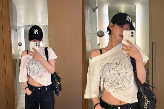 또 다른 사진에서는 스트릿 감성으로 연출한 패션이 눈에 띄었다. 어깨 라인이 드러나는 비대칭 화이트 티셔츠에 만화 캐릭터와 레터링이 더해져 유쾌함을 더했고 블랙 와이드 데님 팬츠는 하이웨이스트 디자인으로 얇은 허리 실루엣을 강조했다. 과하지 않은 액세서리와 장난기 가득한 표정은 카리나 특유의 청순하고 유쾌한 매력을 더했다.