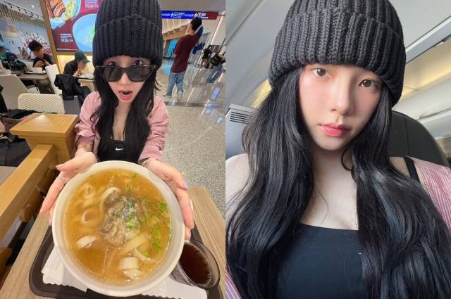 소탈한 매력도 잊지 않았다. 공항 푸드코트에서 큰 그릇에 담긴 국수를 양손으로 든 채 놀란 표정을 지은 사진은 팬들의 미소를 자아냈다. 자연스럽고 친근한 카리나의 매력이 그대로 담겼다.