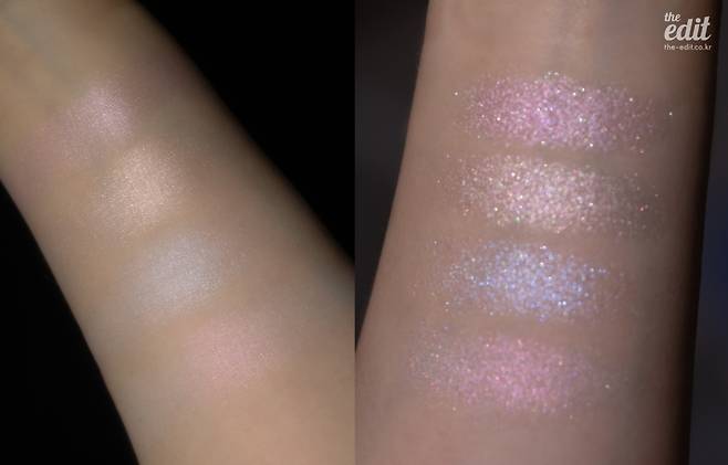 컬러 선정은 확실히 차별점이 보였다. 핑크-샴페인-블루-라벤더 흔치 않은 4가지 컬러 조합은 무난함에 치중된 양산형 하이라이터 컬러보다 훨씬 최근 트렌드와 잘 맞다는 생각이 들 정도. 하지만 웜톤보다는 쿨톤에 치중된 컬러라 웜톤인 에디터는 주관적으로 그 점이 조금 아쉬웠다.