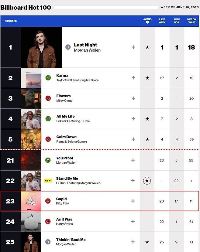 ‘큐피드’는 2022년 데뷔한 신인 걸그룹 피프티피프티가 발표한 노래로, 틱톡, 인스타, 유튜브 등 다양한 플랫폼과 SNS에서 엄청난 인기를 끌었잖아! ✨ 빌보드 차트에 오르는 돌풍을 일으키기도 했고, 빌보드 메인 싱글 차트 ‘핫 100’ 17위까지 오르고 총 25주 진입하는 등 엄청난 기록을 세웠지. 👍