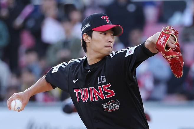 안타 하나면 동점이 되는 상황에서 불을 끄기 위해 마운드 위에 오른 건 한국시리즈에서 '불펜 알바'에 나선 선발 자원 이정용이었습니다. 시작은 좋지 않았습니다. 배정대에게 던진 초구 바깥쪽 포크볼이 포수 박동원이 도저히 잡아낼 수 없는 폭투로 연결돼 주자들의 추가 진루를 허용했고, 결국 배정대와 승부를 하지 못한 채 자동 고의4구로 1루를 채우는 선택을 했습니다.