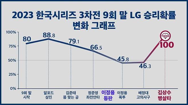 1아웃 만루의 위기를 맞은 LG의 당시 승리확률은 46.3%. 한 점을 앞서고도 오히려 질 가능성이 더 높았던 위기 상황에서 이정용의 진가가 빛났습니다. KT 김상수에게 초구 직구를 스트라이크로 꽂아 넣은 이정용은, 2구째 슬라이더로 투수 앞 땅볼을 이끌어냈고, 포수 박동원에게 침착하게 송구해 '끝내기 병살'을 유도했습니다(승리확률 53.7%p↑). 마지막으로 공을 포구한 1루수 문보경이 격정을 이기지 못하고 공을 그라운드에 패대기쳤을 정도로 결정적인 이 플레이는 결국 LG의 3차전 승리와 우승의 초석을 닦은 한 장면이 됐습니다.