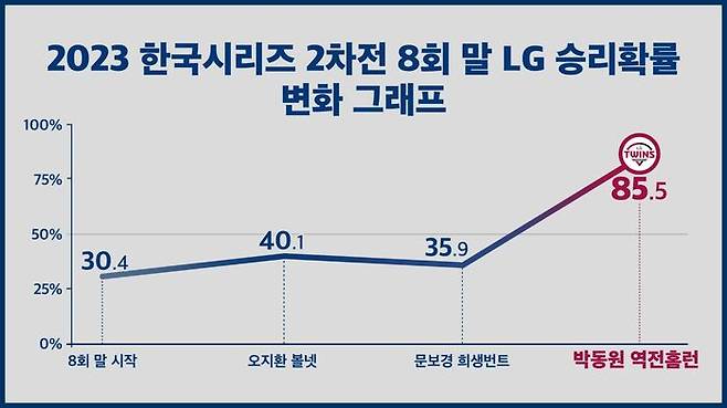 경기는 어느새 8회 말, 4대 3으로 뒤진 LG 타선에게 남은 아웃카운트가 불과 다섯 개뿐이던 시점에서 결정적인 한 방이 터져 나왔습니다. 오지환의 볼넷과 문보경의 희생번트로 만들어진 1아웃 2루 기회에서 타석에 들어선 박동원이 KT 특급 불펜 박영현의 초구 체인지업을 좌중간 담장을 넘기는 비거리 125m짜리 역전 홈런포로 연결시켰습니다. 이 한 방으로 LG의 승리 확률은 무려 49.6%p 치솟았습니다.