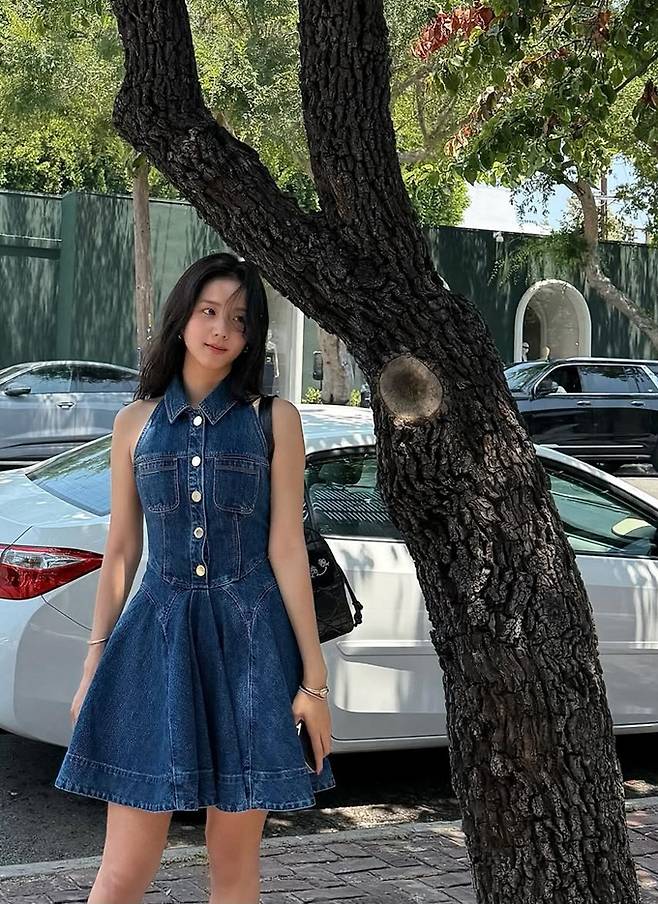 그룹 블랙핑크의 지수가 LA에서 홀터넥 데님 원피스룩으로 단숨에 시선을 사로잡았다.