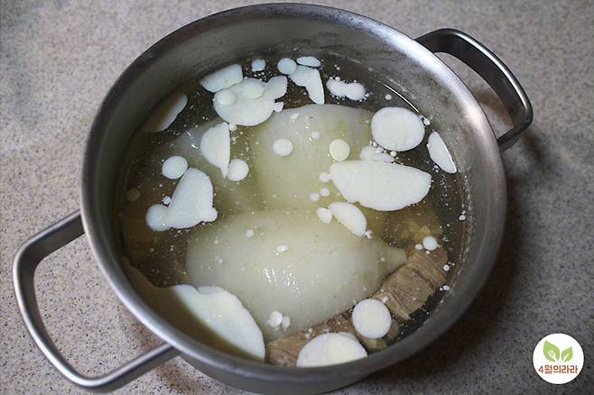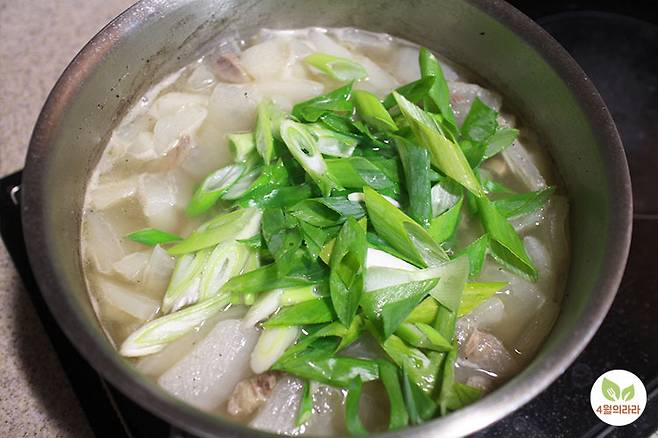 → 무를 넣어 센 불에 넣어 5분 끓이고, 약불로 줄여 1시간 푹 끓입니다.