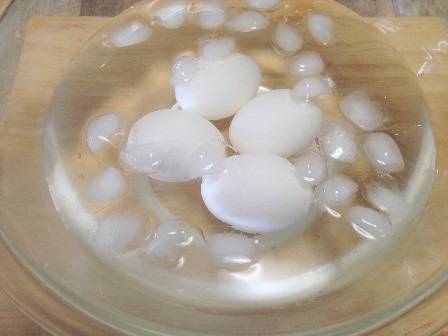 삶은 즉시 찬물이나 얼음물에 5~10분간 식혀 껍질과 흰자 사이를 벌리기