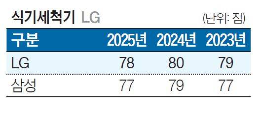 식기세척기 업종의 NBCI 평균은 78점으로 전년 대비 1점 하락했다. LG가 2점 하락한 78점으로 1위 자리를 지켰고, 삼성 역시 2점 하락한 77점을 기록하며 2위를 유지했다.
