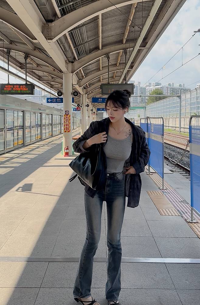 이처럼 핏한 부츠컷 데님과 루즈한 셔츠의 조화는