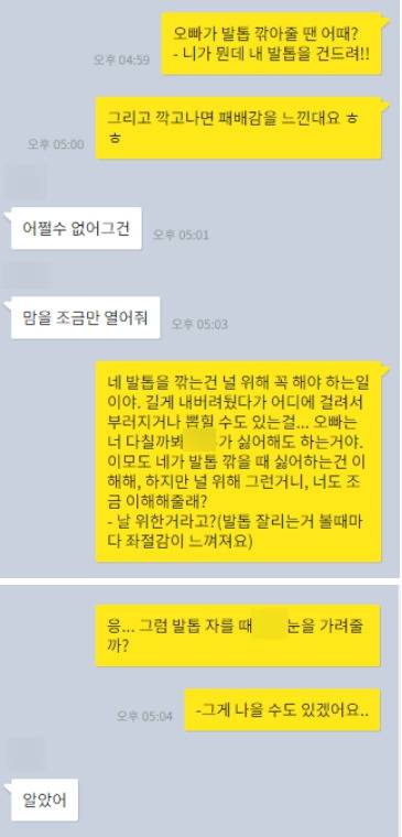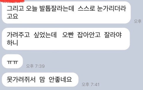 발톱 깎을 때 눈을 가리면 나을 거 같다더니, 스스로 눈을 가리더래요.