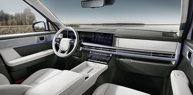 싼타페는 12.3인치 파노라믹 커브드 디스플레이와 6.6인치 터치식 공조 패널, 전자식 변속 칼럼을 도입해 ‘미래형 SUV’에 가까운 이미지를 연출한다. 센터패시아부터 도어 트림까지 이어지는 직선적이고 간결한 디자인은 고급스러운 동시에 기술적 세련미를 풍긴다.