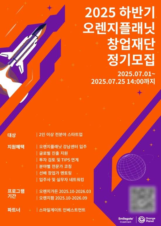 30일 스마일게이트 오렌지플래닛 창업재단(센터장 서상봉)은 2025년 하반기 스타트업 정기 모집을 시작한다고 밝혔다.