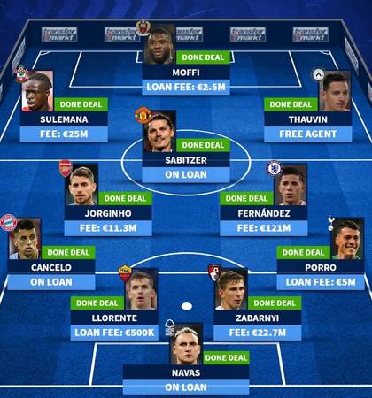 이적시장 마감일 베스트11 공격수에는 술레마나(사우스햄튼), 모피(니스), 토뱅(우디네세)이 선정됐다. 미드필더에는 자비처(맨체스터 유나이티드), 조르지뉴(아스날), 엔조 페르난데스(첼시)가 이름을 올렸고 수비진에는 칸셀루(바이에른 뮌헨), 요렌테(AS로마), 자바르니(본머스), 포로(토트넘)가 포함됐다. 골키퍼에는 나바스(노팅엄 포레스트)가 선정됐다.