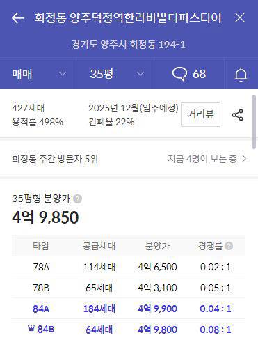5위는 양주시다. 양주시 미분양 아파트는 9곳이며 총 686가구가 미분양으로 남아있다. 이중에서 미분양이 가장 많이 몰린 곳은 2022년 11월 분양한 '양주덕정역한라비발디퍼스티어'다. 경기도 양주시 회정동에 공급되며 분양 당시 'GTX-C 노선'과 '테크로밸리 개발 호재'로 광고했다. 하지만 GTX-C노선 덕정역은 단지에서 30분 이상 걸어가야 하는 위치에 있다. 현재 총 427가구 중 전세대가 미분양으로 남아있다. 분양가는 전용 84㎡ 기준 4억9000만원이다.