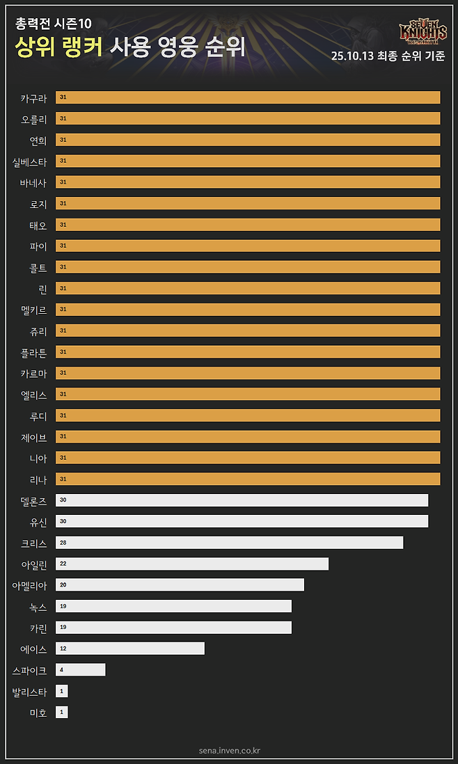 총력전 상위 랭커 사용 영웅 순위출시와 함께 픽률 100% 달성한 카구라 10시즌에서 상위 랭커들이 활용한 영웅은 총 31종입니다. 이 중 모두에게 선택받은 영웅은 19종인데요. 리나와 니아, 제이브, 루디, 엘리스, 카르마, 플라튼, 쥬리, 멜키르, 린, 콜트, 파이, 태오, 로지, 바네사, 실베스타, 연희, 오를리 등이 포함됩니다. 그리고, 10시즌 시작과 함께 등장했던 카구라 또한 100%의 픽률을 기록했죠.