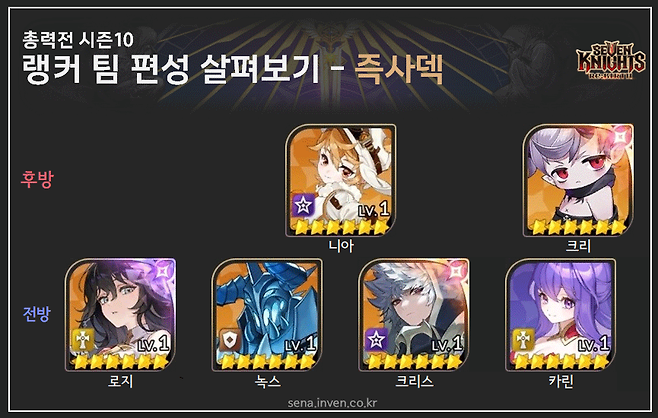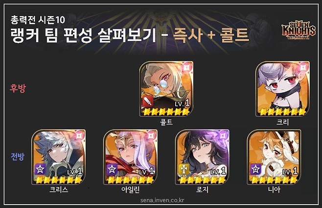 팀 편성 살펴보기 - 즉사덱기존 조합에, 콜트를 활용한 편성까지 즉사덱은 크게 두 가지 형태가 보입니다. 하나는 콜트와 아일린, 니아에 크리스와 로지를 섞는 방식이에요. 녹스가 제외되니 즉사가 조금 약화되긴 했지만, CC가 강화되는 편성입니다. 콜트의 화력도 든든하고요. 카구라와 아멜리아 합류로 아일린, 콜트 자리를 옮길 수 있게 되었기에 가능한 방법입니다.