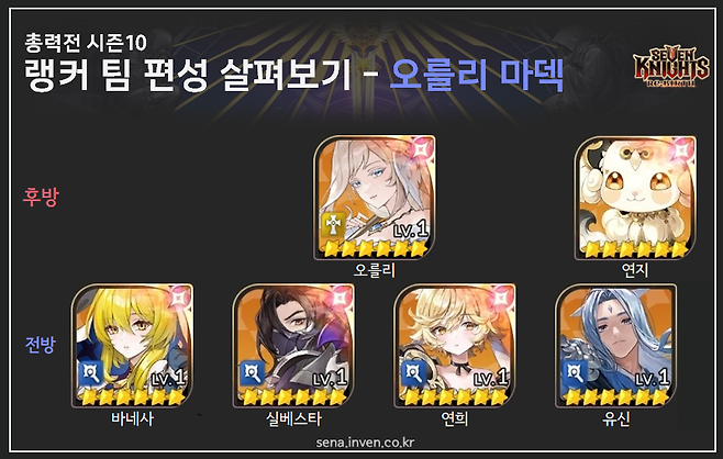 팀 편성 살펴보기 - 마덱플마덱에 채용되기 시작한 아멜리아 마법형 영웅은 보통 총력전에 오를리 마덱과 플라튼 마덱으로 나뉘어 두 팀을 채우게 됩니다. 10시즌도 이건 동일했어요. 오를리 마덱은 주전 멤버도 기존과 같았습니다. 후방에 오를리를 세우고 전방은 연희와 바네사, 실베스타, 그리고 유신이 채우게 됩니다.