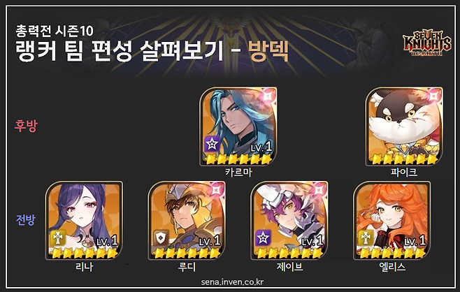 팀 편성 살펴보기 - 방덱여전히 든든하다! 9시즌 조합 유지 방덱은 이번 시즌 변화가 가장 적은 조합입니다. 주전 멤버는 같아요. 카르마, 제이브, 루디, 엘리스, 리나가 그 대상이죠. 매 시즌 후열 딜러 선호도가 조금씩 달라지는데, 이번에는 카르마가 많았습니다. 지난 시즌에도 방덱은 든든한 성적을 만들어주는 카드였어요.