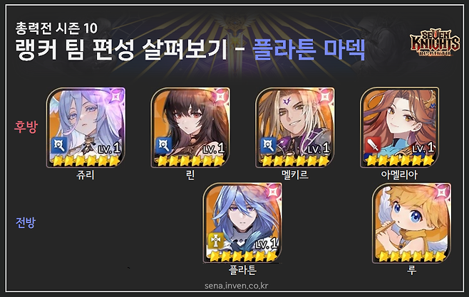 세븐나이츠 리버스의 열 번째 총력전 시즌이 마무리되었습니다. 지난 시즌 총력전 팀 편성에는 많은 변화가 찾아왔는데요. 카구라와 아멜리아가 합류하며 한동안 정형화된 구성을 보이던 팀 편성 방식에 변화가 생겼습니다. 카구라는 주로 공덱 파츠로, 아멜리아는 플라튼 마덱에 배치되었죠. 10시즌 상위 랭커 TOP 30인의 팀 편성 정보를 살펴봤습니다.