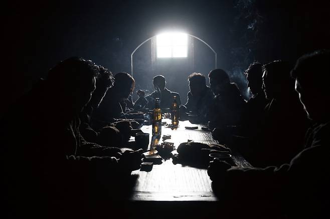 그래서일까. 회화적인 스타일의 정점을 보여준다. 인물화와 풍경화가 거듭 교차된다. 독립군이 볕 한 줌 들지 않는 어두컴컴한 실내에서 줄담배를 피우며 거사를 논하는 장면, 하얀 눈 덮인 신아산의 치열한 전투와 이전투구의 진흙밭, 말을 타고 폭약을 구하러 가는 먼 여정, 칼바람이 느껴지는 얼음강 위를 걷는 더딘 발걸음 등. 조명을 최소한으로 한 빛과 어둠의 대비는 빈센트 반 고흐의 <감자 먹는 사람들>을 떠올리게 한다. 노동 이후 먹는 식사의 감사함은 하루를 살아갔던 민중의 모습이자, 숭고한 의식을 대변한다.