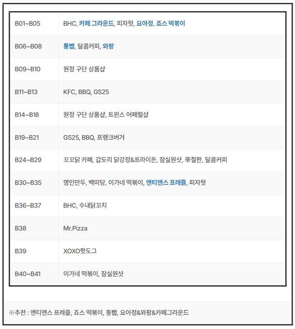 아래에서 소개할 표를 통해 원하는 매장이 위층이나 외부에 있다면 1층에서 웨이팅 하지 말고 2층이나 3층, 외부에서 포장해 오는 것을 추천해 드립니다.