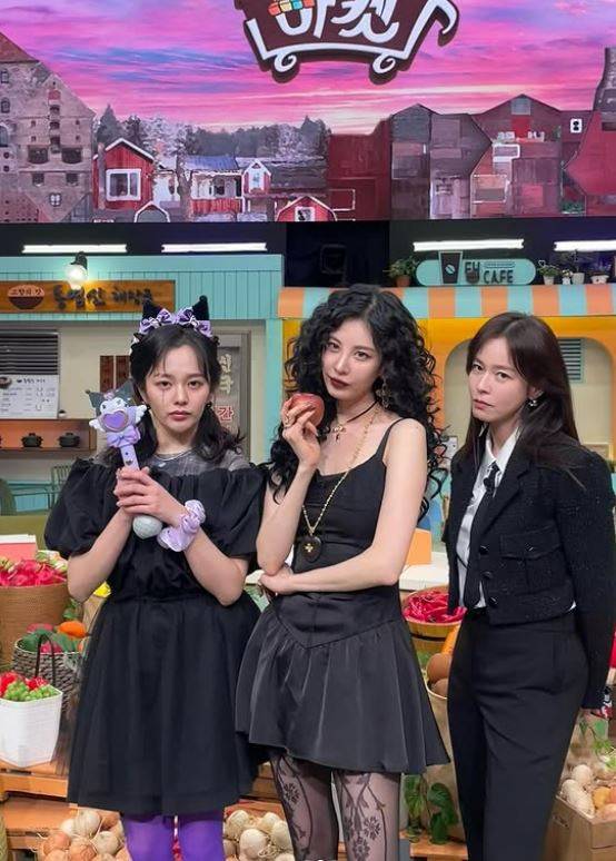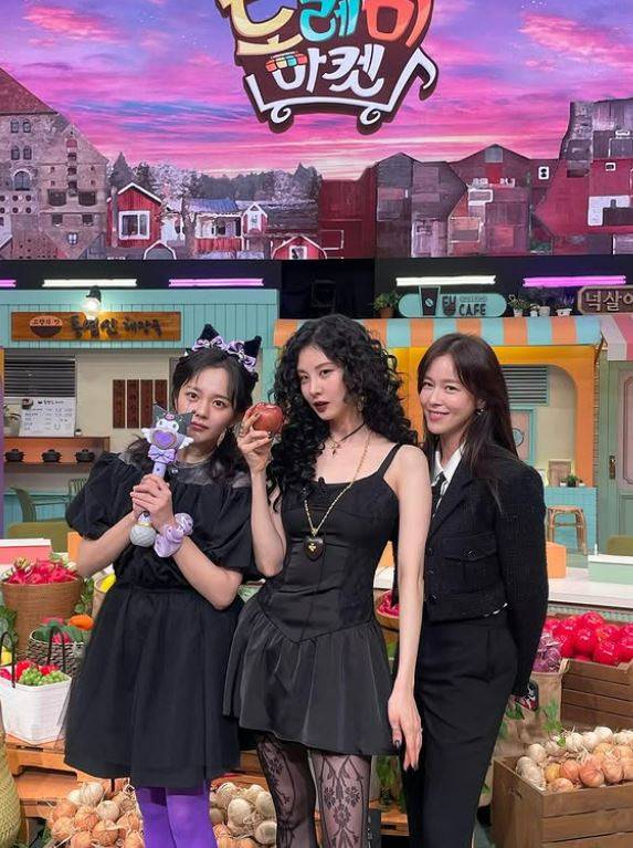 공개된 사진 속 서현은 영화 '거룩한 밤 : 데몬 헌터스' 홍보 차 배우 경수진, 정지소와 함께 '놀라운 토요일' 촬영에 나선 모습입니다.