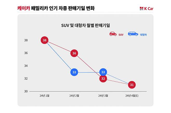 케이카는 차량 판매 데이터를 분석한 결과, 4월 대형차 및 SUV 모델의 판매 기일이 1월 대비 약 18% 단축된 31일이 될 것으로 전망했다. 여기서, 판매 기일은 자동차를 매입 후 판매까지 걸리는 시간을 말한다.
