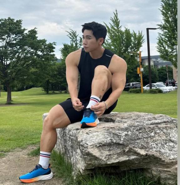 공개된 사진 속 그는 검은색 민소매와 반바지를 입고, 러닝화 끈을 묶는 포즈로 자연스럽게 운동 중임을 암시했습니다. 그런데 눈에 띈 건 단순한 러닝복 차림이 아니었습니다.