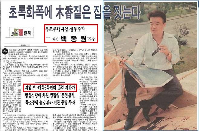 다만 백종원에게 주사업은 건설업이었고 백종원은 90년대 당시 건설업계의 호황에 힘입어 사업 규모를 확장해 나갔습니다. 실제로 백종원은 1994년 목조주택으로 눈을 돌려 시공회사까지 차렸는데요. 1996년 서른 살이던 백종원은 신문사와의 인터뷰를 통해 "목조주택 자재 구입은 축적된 노하우가 없으면 엄두도 못 내는 일"이라며 자신감을 드러내기도 했습니다.